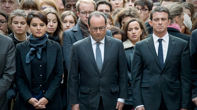 French President Francoise Hollande and French Prime Minister Manuel Vallse observe a minute of silence for the victims of the Paris terror attacks.Maxppp via ZUMA