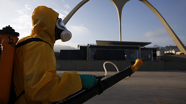 A worker in Brazil disinfects the famous Sambadrome as part of the fight against the mosquito Aedes aegypti, which spreads the Zika, dengue, and chikungunya viruses.Marcelo Sayao/ZUMA