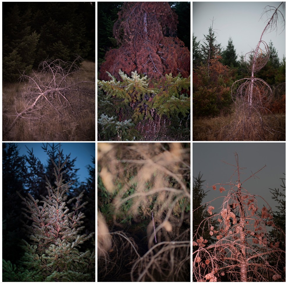 In the wide, flat expanse of the nursery, the firs were rimmed by fallow land on all sides. St. Clair instructed me to put on safety glasses, and then ducked down, pushed aside the outermost branches, and slipped into the trees. I followed him. Within two steps, there we were in a veritable, dense forest, as if an enchanted wardrobe had been pulled open to reveal a world transformed. On the periphery it had been hot, but here, as we moved through the dapple, it was cool and fragrant with pine.