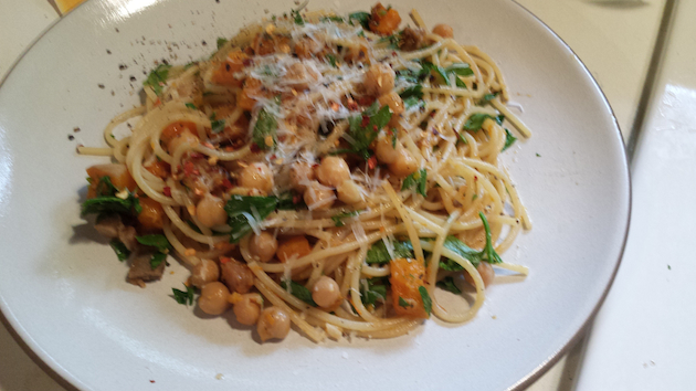 Spaghetti With Butternut Squash, Bacon, and Chickpeas