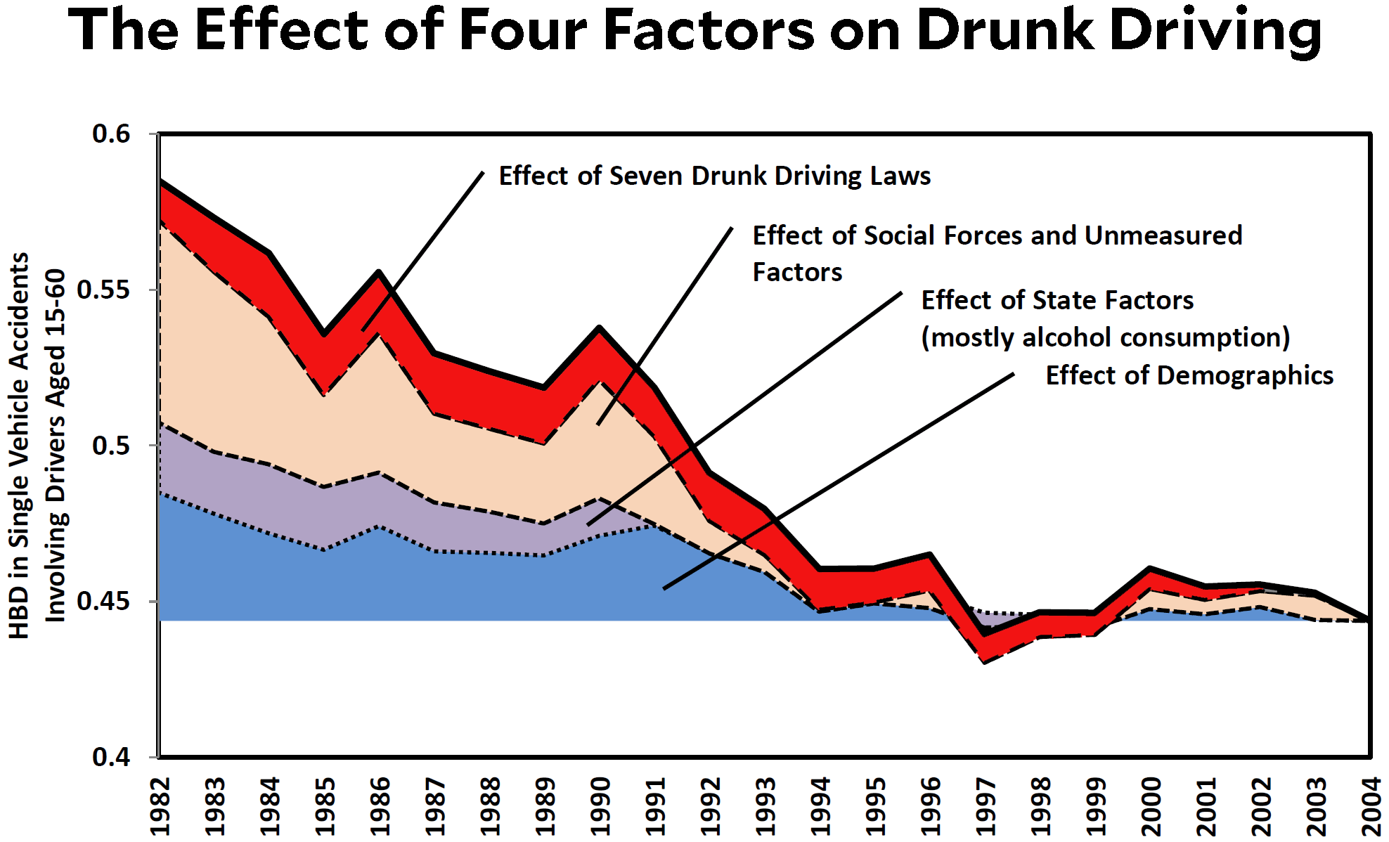 - The effect of laws on drunk driving has been pretty modest. That’s the red band in the chart. Stricter laws are responsible for only a small fraction of the total decline.