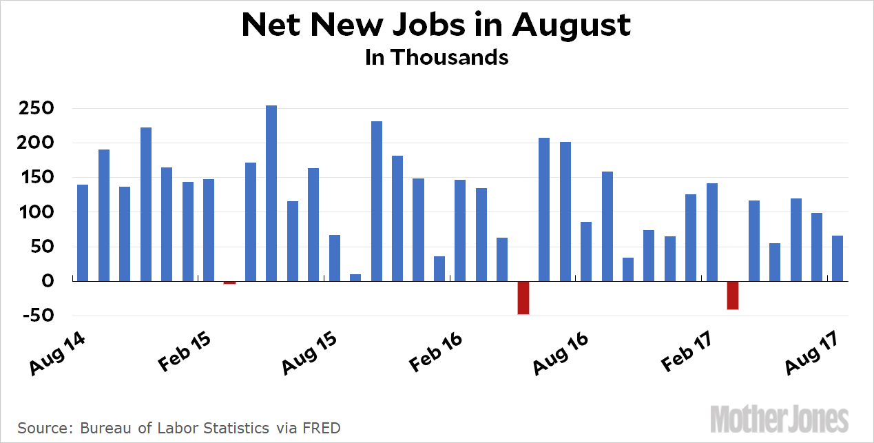 The American economy added 156,000 new jobs last month, 90,000 of which were needed to keep up with population growth. This means that net job growth clocked in at 66,000 jobs. That’s pretty anemic, but August usually tends to be sort of an anemic month for job growth. The headline unemployment rate ticked back up slightly to 4.4 percent, all of it for bad reasons: the number of employed people declined and the number of unemployed people increased. But there was good news for some: the unemployment rate for high school dropout plummeted from 6.9 percent to 6.0 percent.