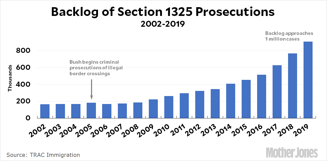This is where things get dubious. Nobody seriously believes that Section 1325 prosecutions are responsible for this entire decline. It was mostly due to the Great Recession, which wrecked the US economy and eliminated a lot of the jobs that motivated migrant workers to cross the border. So the question now becomes: just how much of this decline is due to Section 1325 prosecutions? There’s no simple answer to that, but it’s a good guess that, in fact, the decline in 2006 is just noise and the decline in 2007 might be due partly to Section 1325 and partly to the shaky US economy. The rest is probably driven entirely by the economic collapse. In other words, it’s likely that the prosecutions actually had only a modest effect on the overall picture. Further evidence for this is the fact that prosecutions are monumentally backlogged: