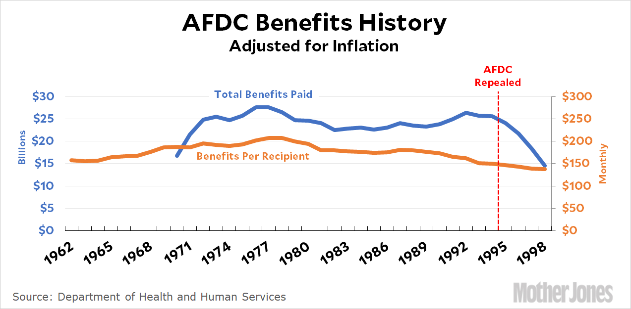AFDC started out as a program for (white) widows. That was no problem: back in the 30s no one expected (white) widows to work so giving them a living allowance was widely supported. In the early 60s it expanded to incude any family where the father didn’t work. People grumbled a little bit. In the late 60s black women were allowed to get AFDC benefits. More grumbling. Then benefit requirements were eased, leading to larger enrollments. Yet more grumbling. And that was about it through the 1990s.