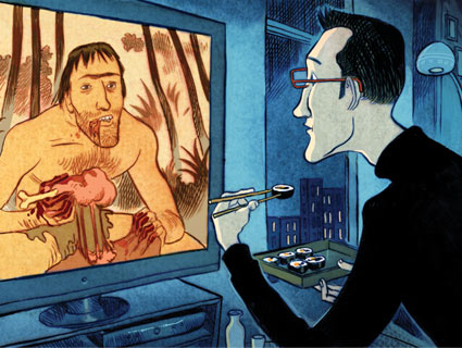 “The whole survival thing is a sham,” he says between bites of braised meat. “To fashion an arrow from a Coke bottle and kill a wild turkey…It’s just a voyeuristic fantasy thing, no different than watching Dungeons & Dragons.” Rinella might be calling the kettle black a bit—in one episode, he stuns a live octopus by biting it—but it’s still a point well taken. While your average cooking or home-improvement show at least pretends to have some immediate application, fans of reality-survival shows can’t exactly get off the couch and fashion a wet suit from a seal carcass. How many of them would even want to?