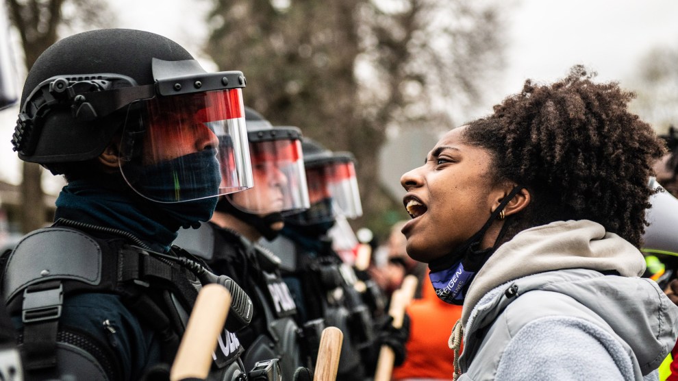 A protestor confronts police during a demonstration over the death of Daunte Wright in Brooklyn Center, Minnesota.ImageSPACE/Zuma
