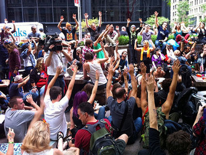 In the clip below, a protester tells Waging Nonviolence that “the demands will come…and they will come organically out of these people.” But so far, it’s been a whole lot of posturing, conch passing “mic checks“, and white noise. Check out this catalog of “one demands” from the “Occupied Territory of Wall Street,” a Christmas list that includes ending capital punishment, wealth inequality, police intimidation, corporate censorship, joblessness, American imperialism, and war. There’s something there for everyone, but no one clear message that can carry a movement forward.