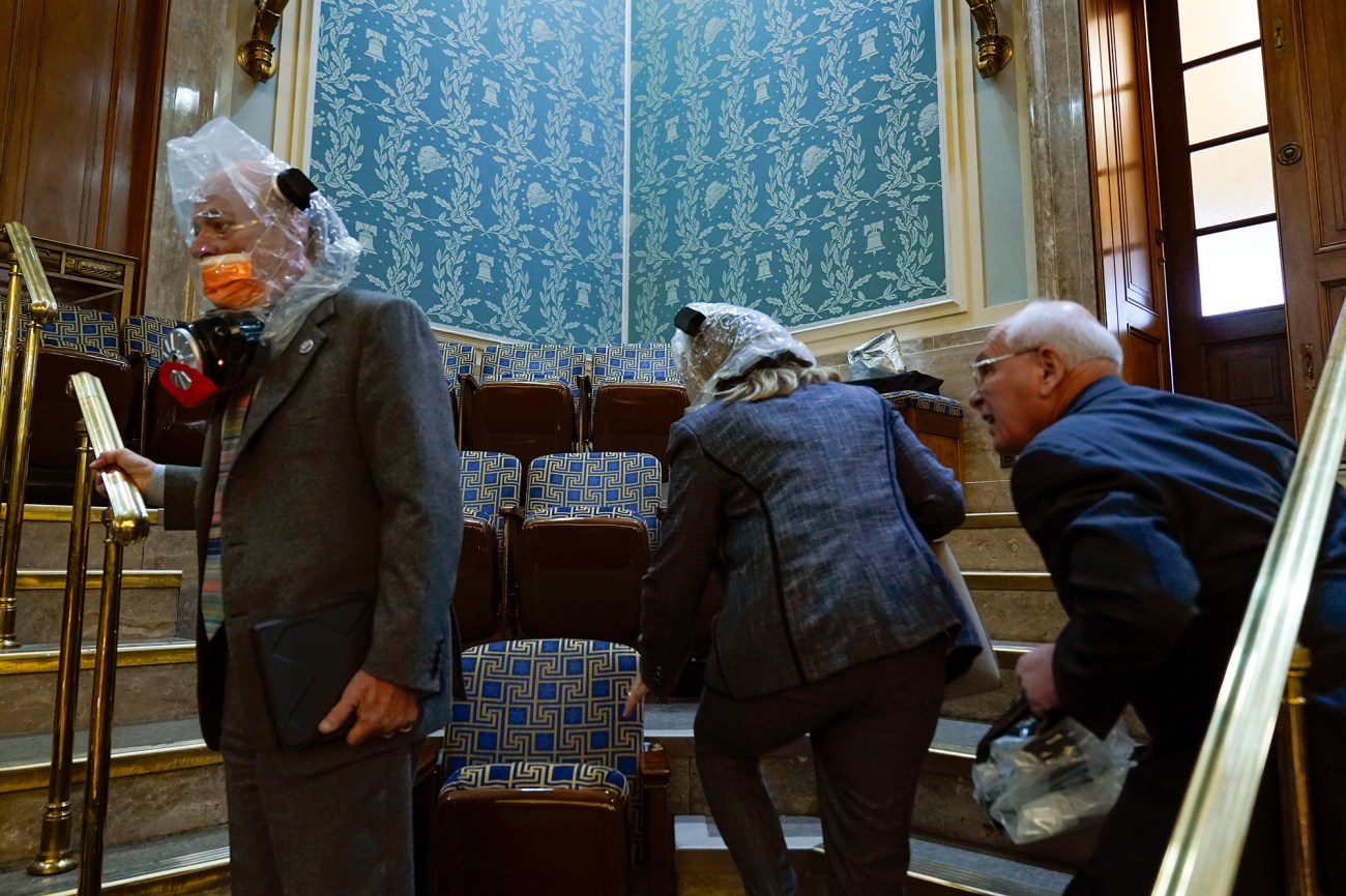 People shelter in the House gallery as protesters try to break into the House Chamber.