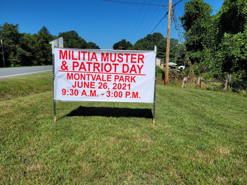 A roadside banner off a busy road in Bedford County promotes the militia’s second annual muster.