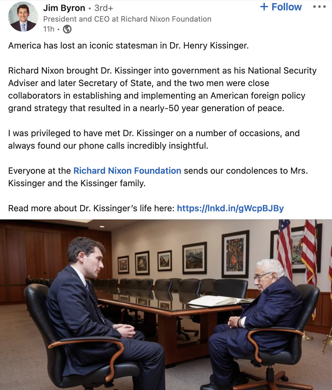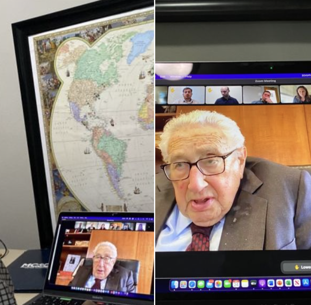 “With the doyen of diplomacy,” is how one self-described journalist captioned a photo featuring him and a very fragile-looking Kissinger. Others, including one Johns Hopkins alum and former Navy pilot, have memorialized virtual meetings with Kissinger over Zoom. “At just one month shy of 100 years old, his mind was still sharp and his ability to recall historic events was impressive, to say the least. RIP to one of the most consequential men in history.”