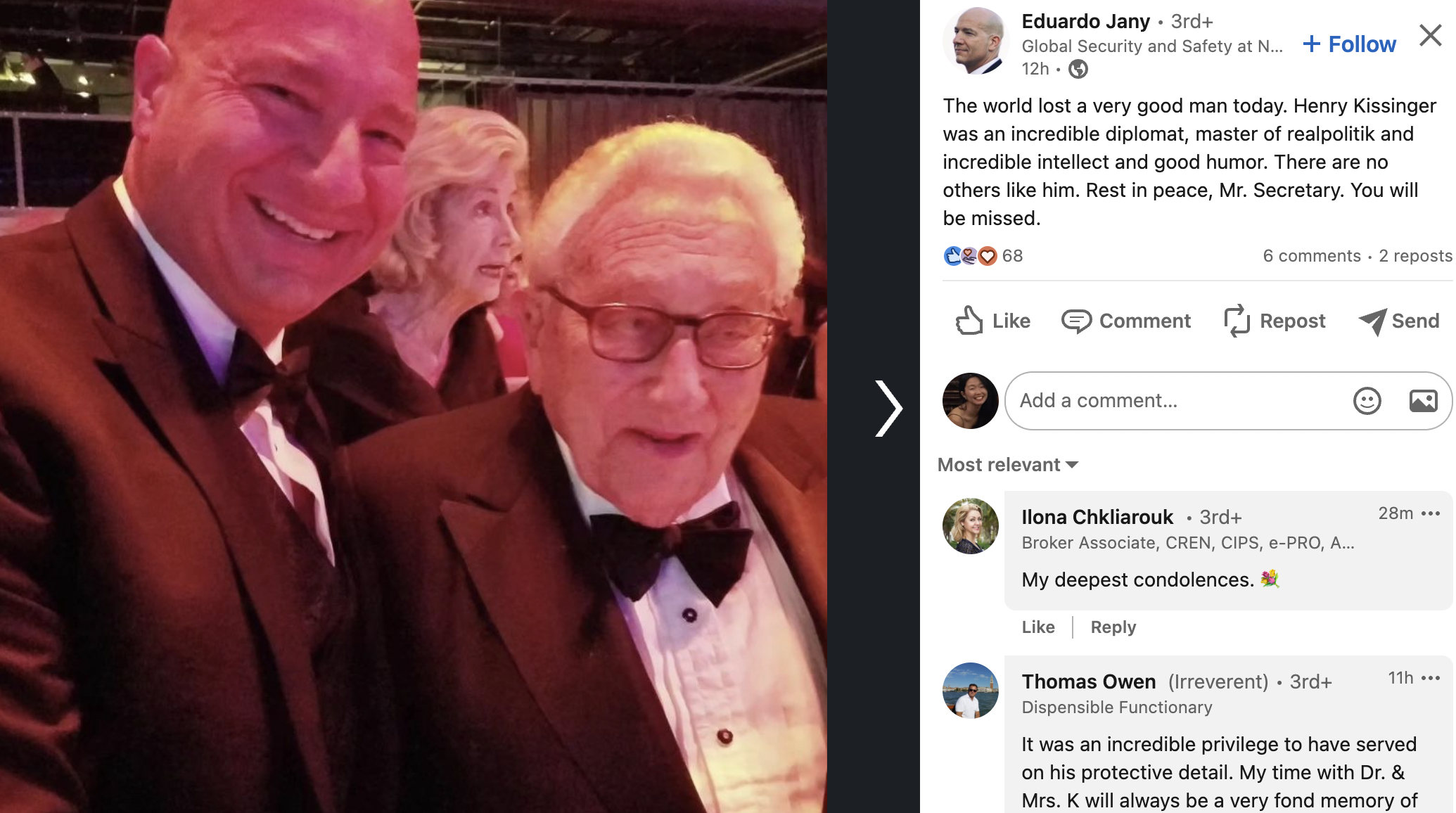 The result has been a parade of photos, invariably greasy and blurry, featuring LinkedIn users noting their honor to have met Kissinger at some point in their careers. Mentions of coup-plotting and carpet bombing are scant if not nonexistent, reminiscent of the same vaunted boardrooms and exclusive parties that allowed Kissinger to skate above his bloody record after he left Washington.