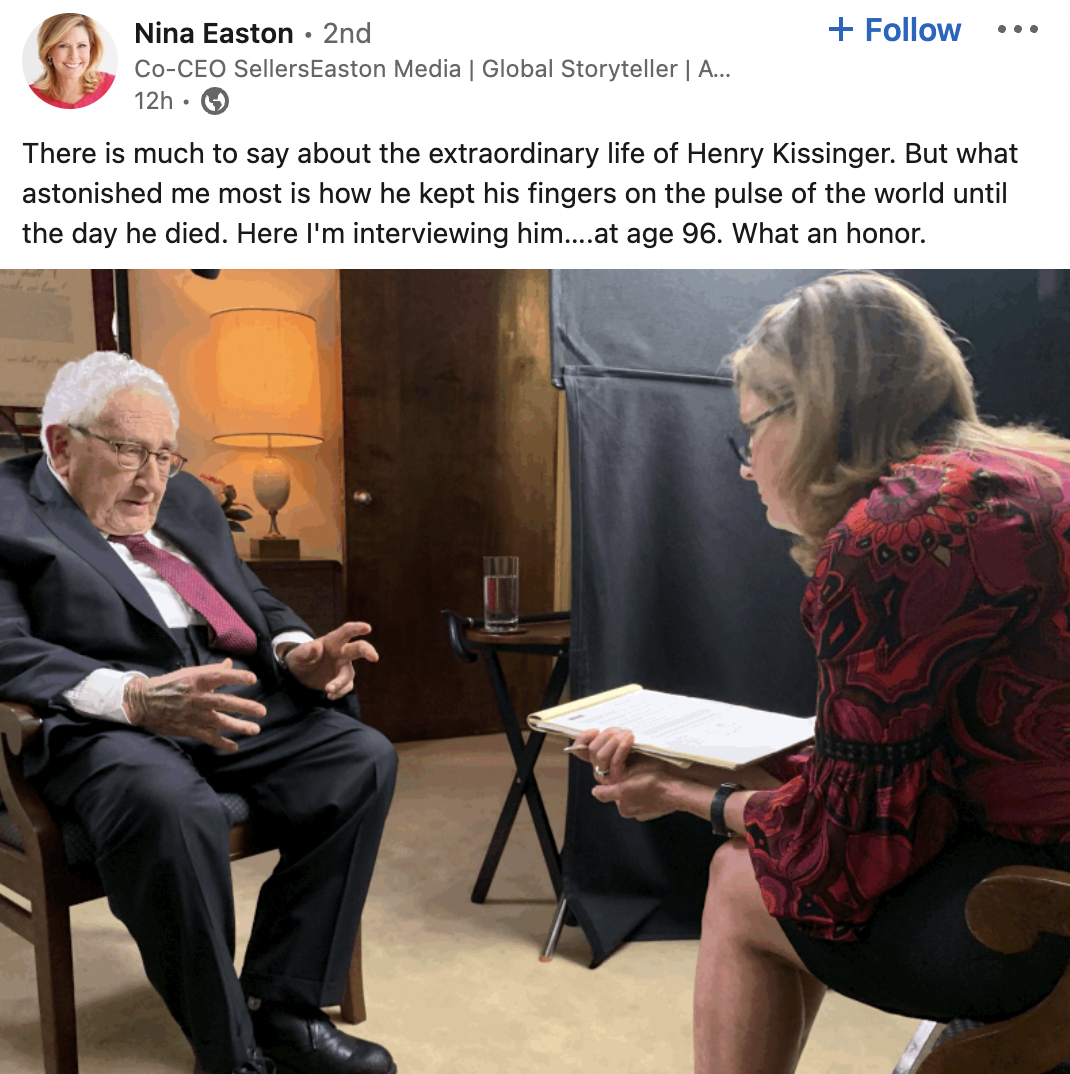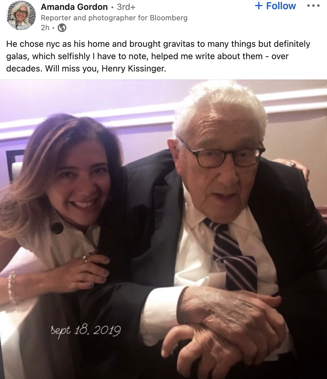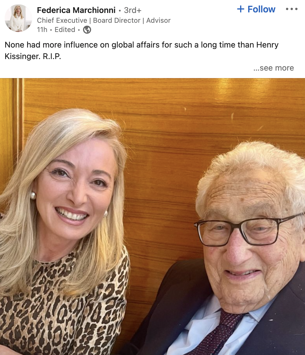 Henry Kissinger’s death at 100 on Wednesday, after a storied career drenched in blood and unchecked war crimes, has sparked both dutiful tributes and notes of justified revulsion from around the world. But in one corner of the internet, merchants of corporate aspiration have been activated, celebrating what appear to be random encounters with the former secretary of state. The apparent purpose? To tout one’s incidental proximity to the veteran statesman.