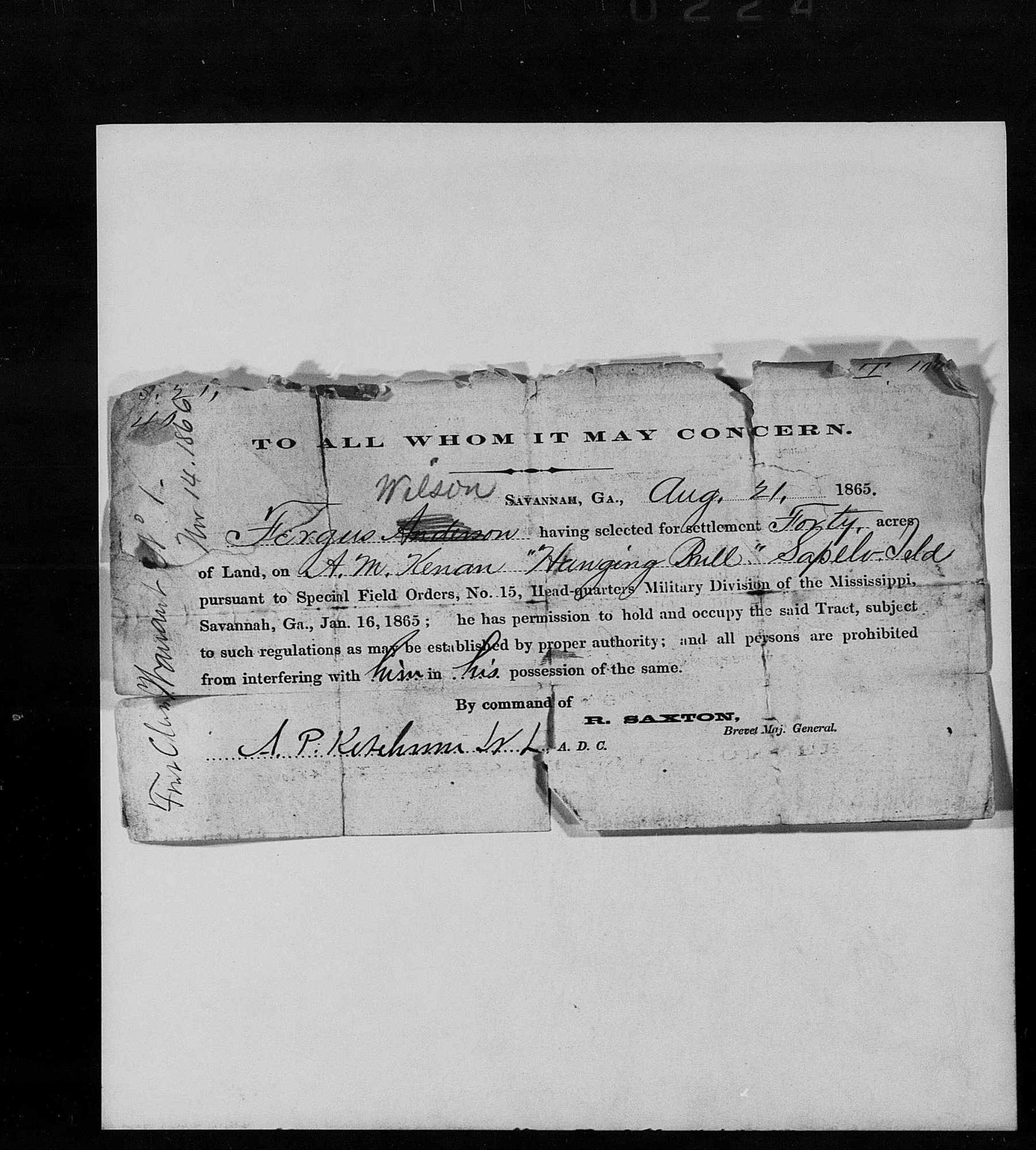 One was dated 1865 and named Fergus Wilson as the recipient of 40 acres on Sapelo Island, Georgia. I was looking at documents in the Smithsonian’s digital archives of the Freedmen’s Bureau, in a folder labeled “Unbound Miscellaneous Records.”